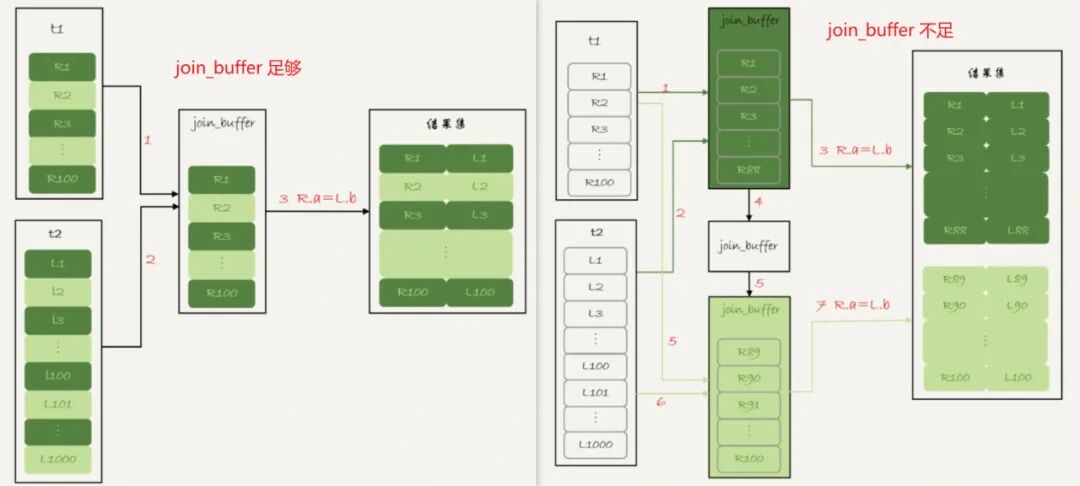 1️⃣ 扫描表 t1,顺序读取数据行放入join_buffer中,若join_buffer满了,继续第2️⃣步;