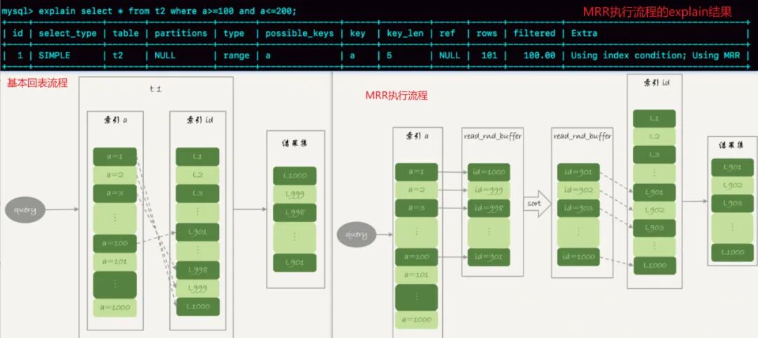 create table t2 like t1; -- 在表t2中插入 100w 数据select * from t1 where a>=1 and a<=100;如上查询中,涉及回表过程,回表是一行行搜索主键索引的。但是随着a的值递增顺序查询的话,id的值就变成随机的了,那么就会出现随机访问磁盘,性能相对较差。因为大多数的数据都是按照主键递增顺序插入的,所以我们可以认为,如果按照主键的递增顺序查询的话,对磁盘的读比较接近顺序读,能够提升读性能。所以MRR 优化的设计思路是这样的: