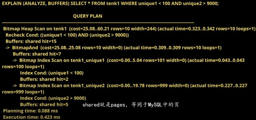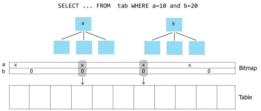 3️⃣bitmap scan : too much row for an index scan to be efficient but too little for a sequential scan,如下图: