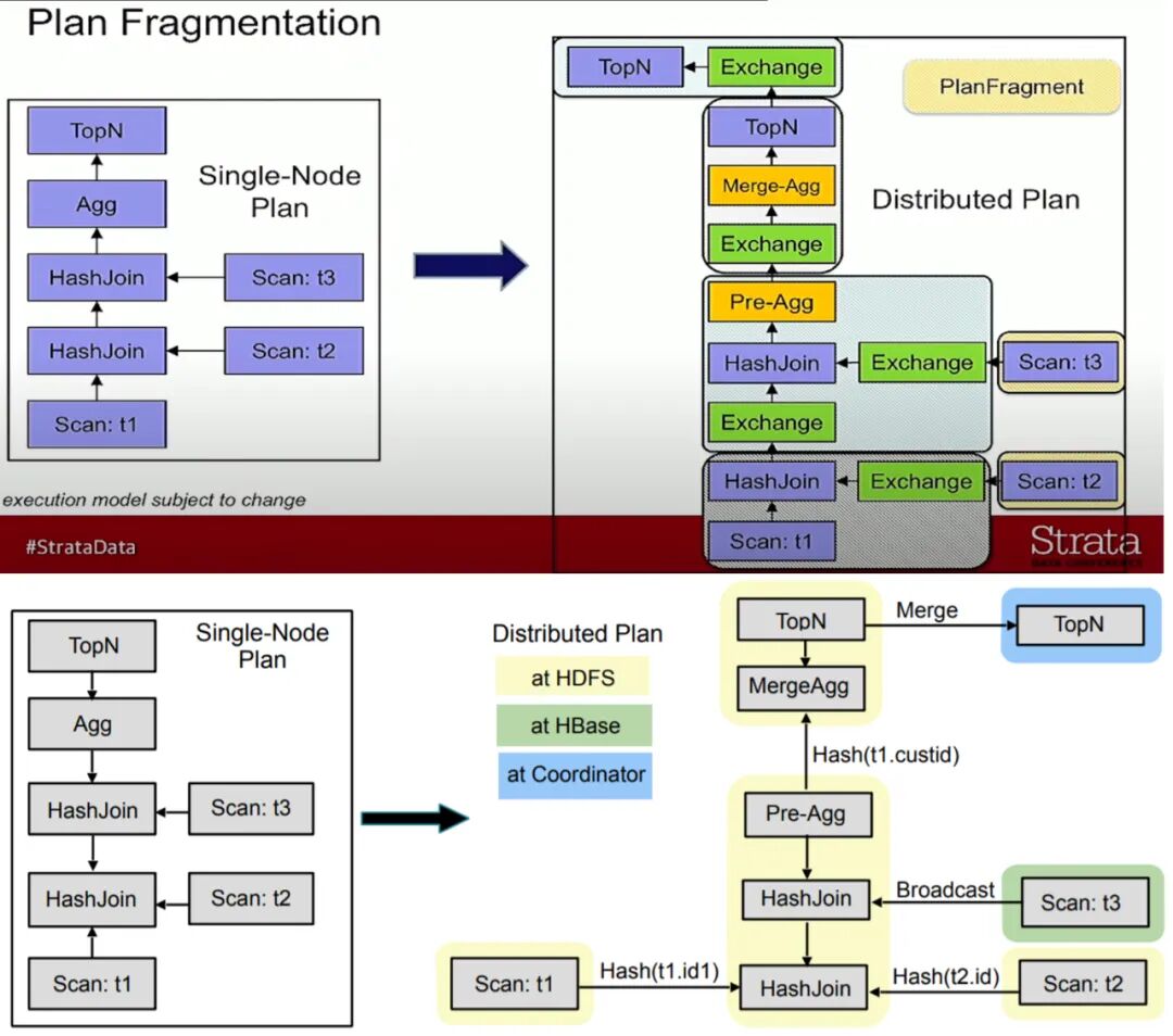 上图(上半部分来源于视频,下半部分来源于论文)展示了Impala的执行计划分为2个阶段,