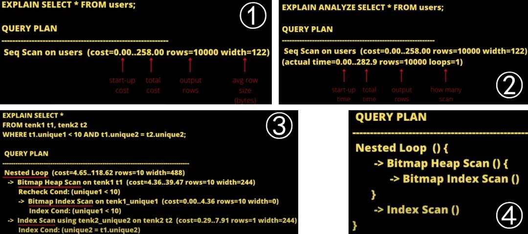 上图是PostgreSQL的执行计划4的例子,①图和②图的区别是②中增加了analyze参数,该参数会触发当前查询实际执行;③号图中的执行计划可以缩略为④号图,类似编程语言中的函数调用
