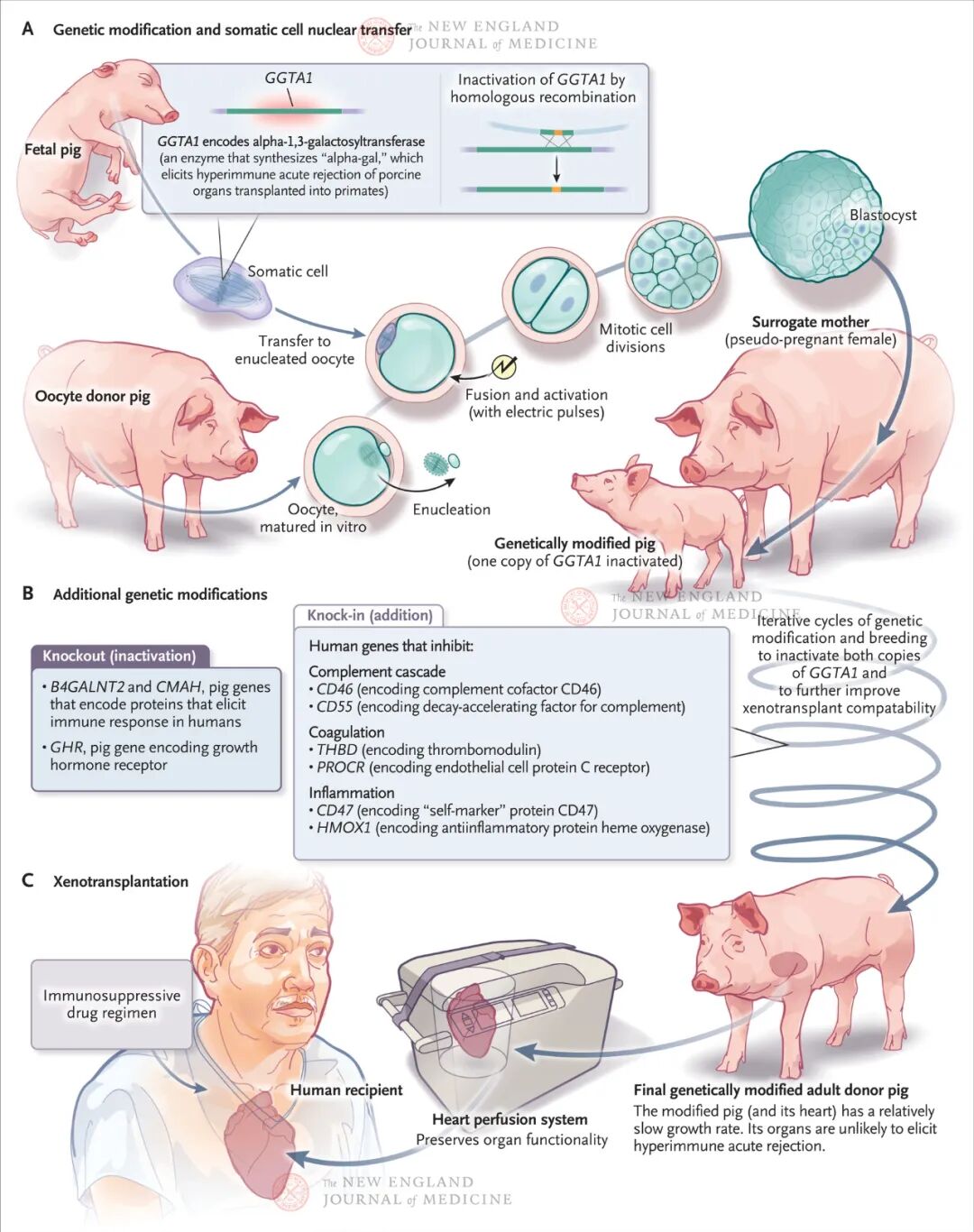 2022年6月22日,《新英格兰医学杂志》(NEJM)在线发表美国马里兰大学医学院Bartley Griffith等人开展的世界首例基因编辑猪心人体移植病例详情,首次披露患者为何被拒绝人体心脏移植、供体猪饲养、抑制免疫排斥措施、术后紧急处置和猪心非典型排斥直至衰竭等关键内容。今年早些时候,这例异种移植的初步成功和患者最终不明原因死亡曾被广为报道(点击阅读详情)。