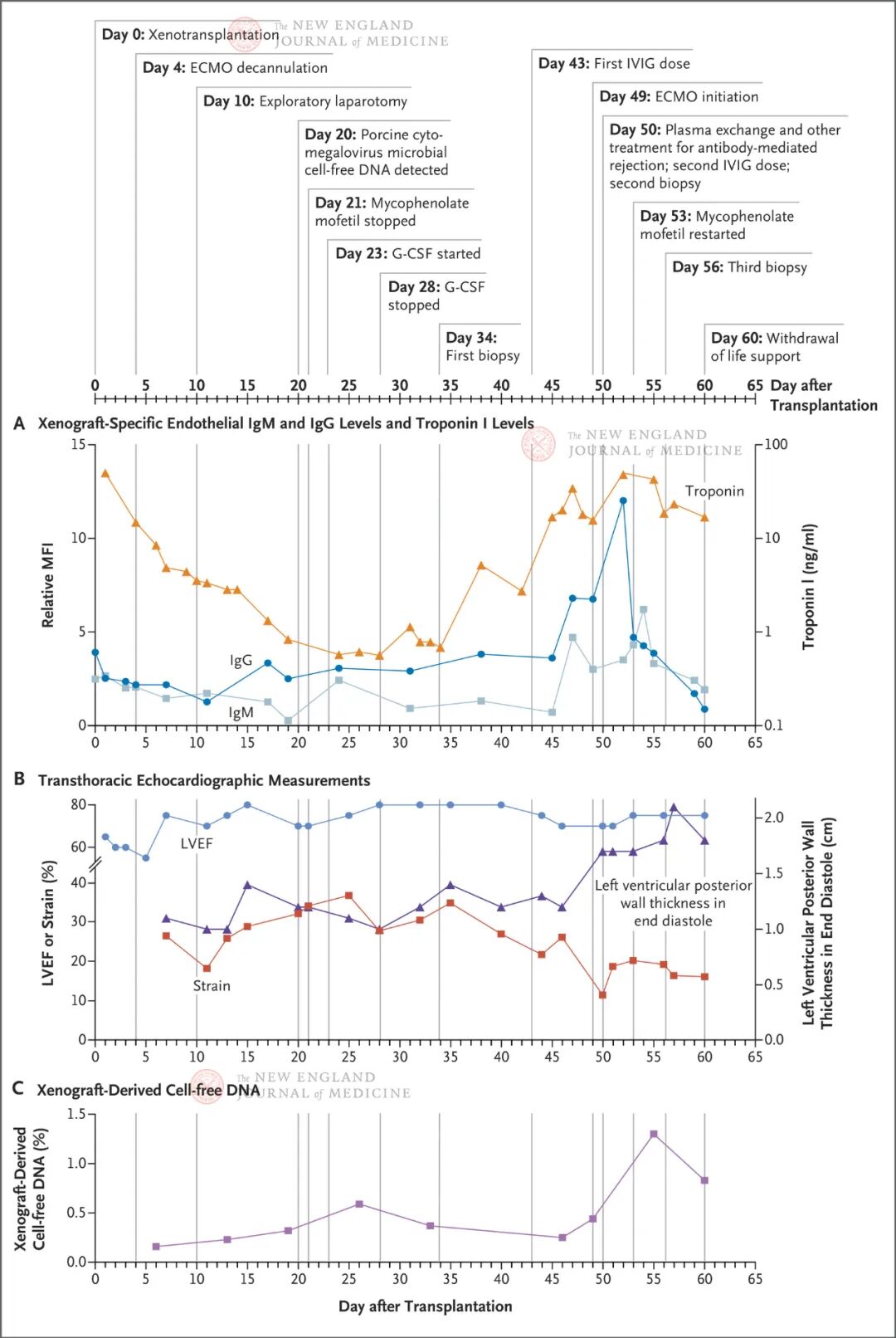 异种心脏支持患者存活7周。用于耗竭T细胞和B细胞的诱导方案,联合基于CD40的疗法似乎预防了人体对基因编辑异种移植物的明显排斥。对异种移植物进行的心内膜心肌活检未显示急性细胞或抗体介导的排斥。直至导致患者需要ECMO支持的后期功能障碍发生后一周才观察到补体染色。明显的突发舒张功能衰竭,以及收缩功能无障碍的整体病理性心肌增厚仍然无法解释。