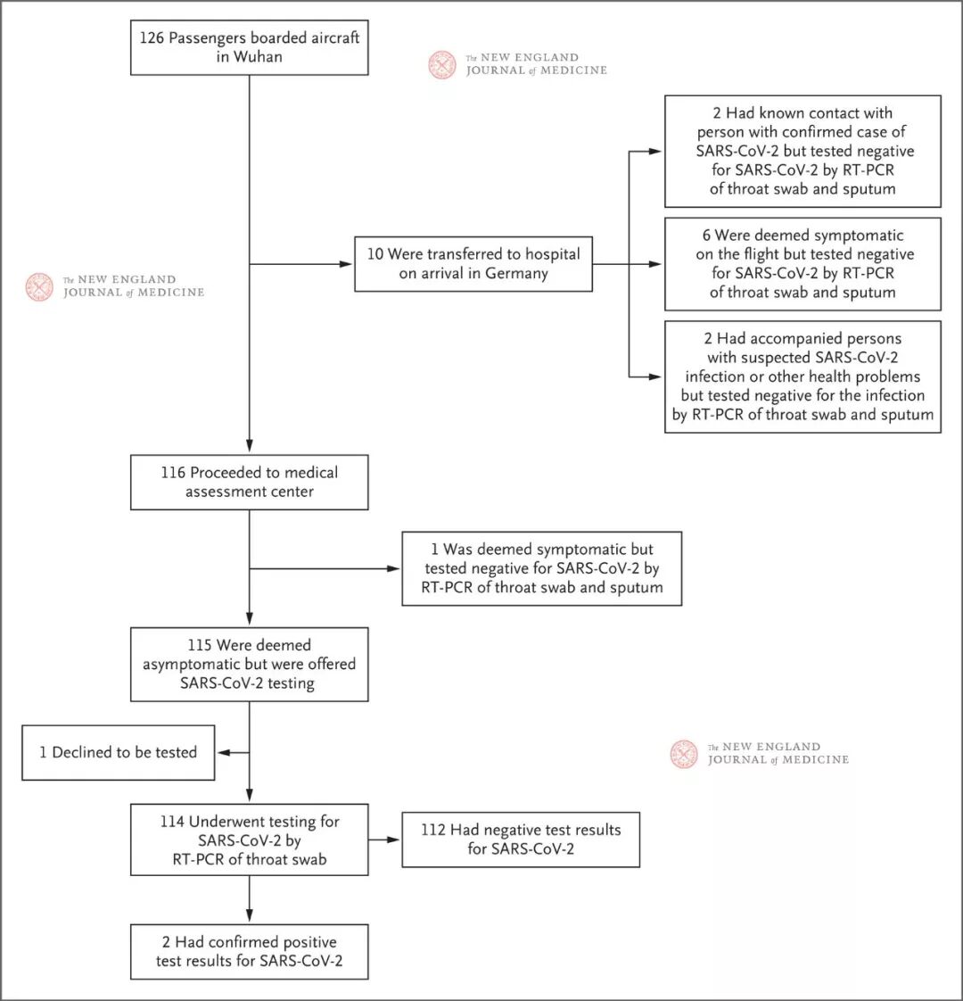 随着新型冠状病毒(SARS-CoV-2)感染病例数量的持续增加,许多国家对近期去过中国的旅行者设置了限制。中国湖北省采取封锁措施,世界卫生组织宣布此次疫情构成国际关注的突发公共卫生事件之后,外籍人士一直试图从中国返回,而公共卫生机构正在全速遏制Covid-19(SARS-CoV-2感染引起的疾病)的全球传播。这一过程因流行病学的不确定性(无症状或有亚临床症状感染者可能传播病毒)而复杂化。目前尚不清楚无呼吸道感染症状或体征的人是否排出SARS-CoV-2。在这一背景下,之前在湖北省的一些以德国人为主的人员于2020年2月1日被撤到德国法兰克福。他们被转移到德国盖默斯海姆并隔离观察14天,因为14天被认为是SARS-CoV-2潜伏期的上限。他们离开中国之前接受了感染症状和体征筛查。共有126名旅行者获准登上德国空军飞机(图1)。乘客从中国武汉飞到德国法兰克福后接受了评估,以确定是否感染了新型冠状病毒(SARS-CoV-2)。所有检查都是为了检测SARS-CoV-2。在飞行途中,10名乘客被隔离。其中2名乘客曾经与1名SARS-CoV-2感染确诊病例接触,6名乘客报告有症状、被认为有临床症状或者同时有这两种情况,2名乘客的同行家人因疑似SARS-CoV-2感染或者因其他症状(即妊娠相关症状)在飞机上被隔离。飞抵法兰克福后,这10名乘客立即被转到法兰克福大学医院(University Hospital Frankfurt)。10人的咽拭子和痰样本实时逆转录聚合酶链反应(RT-PCR)SARS-CoV-2检测结果均为阴性。其余116名乘客(5个月至68岁;包括23名儿童)被送到法兰克福机场的医学评估中心,医师团队在那里对每人进行了评估。每名乘客都被要求报告目前的症状,包括发热、疲劳、咽喉痛、咳嗽、流涕、肌肉疼痛和腹泻,并且每人都接受了鼻部和喉部感染体征筛查。医师测量了所有乘客的体温。除1名乘客体温为38.4°C并报告有呼吸困难和咳嗽之外,其他所有乘客均无发热。这名发热患者被转到法兰克福大学医院接受评估。但咽拭子和痰样本的RT-PCR SARS-CoV-2检测结果均为阴性。除根据原计划对感染症状和体征进行多步骤筛查,并且对隔离的无症状乘客进行观察外,我们还决定对经过之前分流的115名旅行者提供针对SARS-CoV-2的咽拭子检查。共114名乘客同意接受检查。在经过症状筛查后无症状的114名乘客中,有2人(1.8%)的RT-PCR SARS-CoV-2检测结果为阳性(两个样本的循环阈值分别为24.39和30.25)。医师使用两种市售试剂盒(LightMix Modular SARS CoV-2 E-gene以及LightMix Modular CoV-2 RdRP-gene,均由TIB MOLBIOL生产)对阳性样本进行了二次检测,还在德国马尔堡菲利普斯大学(Philipps University Marburg)病毒学研究所对阳性样本进行了再次检测,证实了阳性结果。此外,在Caco-2细胞培养中,从两份样本均分离出了SARS-CoV-2,这表明有潜在传染性(见补充附录,补充附录与本文全文可在NEJM.org获取)。这两名患者随后与其他人隔离,并于次日被转到法兰克福大学医院传染病科进行进一步评估和观察。在医院病房进行全面评估后,一名患者被发现有轻微皮疹和轻微咽炎。在入院后7日,两名患者均状况良好,无发热。在将126人从武汉撤到法兰克福的工作中,症状筛查未能检测出2人的SARS-CoV-2感染,之后的咽拭子检查发现这2人有SARS-CoV-2感染证据。我们发现,无发热并且无感染体征或只有轻微感染体征的人可能排出可能有传染性的病毒。
