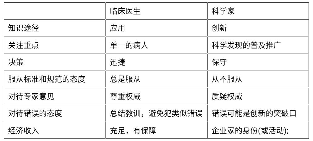表1:区别临床医生和科学家的七大特质