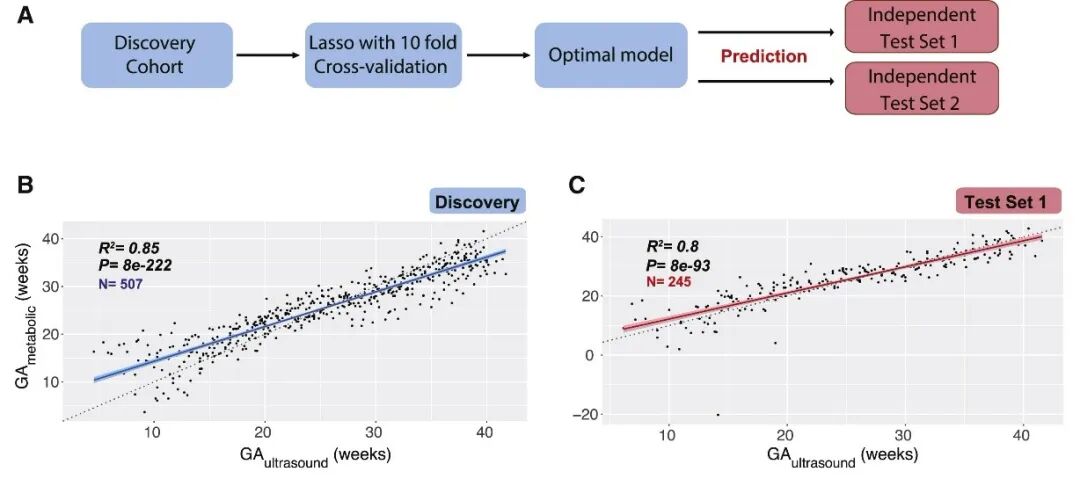 A. 研究步骤。B和C. 通过机器学习确定的5种血液中代谢物,在发现队列和验证队列预测的孕期与标准超声检测的比较。![]()