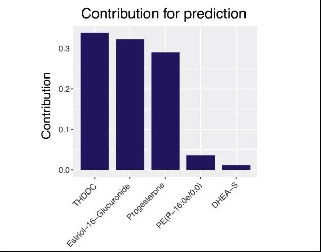 针对开篇提到的预测怀孕时期以及分娩时间的医学难题,研究人员使用机器学习等人工智能算法,利用检测到的血液分子进行模型建立和预测。其中,使用42个代谢小分子信号建立的线性模型,在两组相互独立的人群中,对分娩时期的预测均达到了高精确度(发现队列的Pearson相关系数R,0.96;验证队列R,0.95)。接下来,研究人员进一步精简了预测模型,仅使用包括孕酮在内的4种激素和1种脂质,仍能够准确预测分娩时期(发现队列R,0.92;两个独立的验证队列R分别为0.89和0.91)。![]()