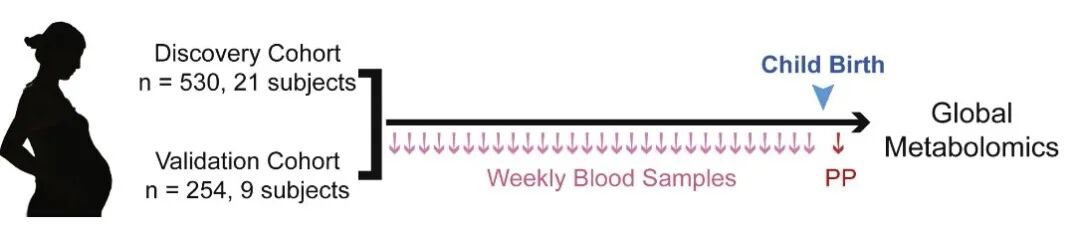 6月25日发表于《细胞》杂志上的一项斯坦福大学遗传系Michael Snyder和丹麦血清研究所Mads Melbye团队开展的研究,有可能帮助医生和孕妇解决这一难题。这篇论文表明,检测孕妇血液中的5种代谢分子即可准确预测孕期时间和生产,其准确性甚至超过目前的金标准超声检查。目前怀孕时期和预产期的确定主要是通过胎儿体重,最后一个月经周期时间,以及孕期超声。前两种方式准确率都不高,而超声虽然可通过测量胎儿给出预产期和当前怀孕周期,但其准确率有限,只有大约2%~5%的孕妇在预产期分娩。除此之外,超声预估预产期的准确率随着孕期进展而大幅降低。目前,全球很多地区不具备为每位孕妇在孕早期进行超声检查的能力,因此大约三分之二的孕妇不知道自己的怀孕时期。即使在发达国家,也有多于三分之一的孕妇(在美国,这一数字为每年900,000名)因早期孕检缺失而无法获知准确孕期信息。另一方面,孕期对母亲和孩子未来健康都是极为关键的时期。怀孕本身为女性会带来巨大生理变化,包括血量增加一半,以及血糖变化等等。然而,孕期绝大多数基础血检结果的对照基准值范围来源于非怀孕女性数据。那么,孕妇血液中分子含量的基准线是什么,又如何随着孕期变化呢?带着这些问题,这篇论文的第一作者、斯坦福大学医学院遗传系梁靓等通过对孕产妇每周血液的检测,首次确定了怀孕及产后女性血液中近一万个代谢小分子信号随着孕期及分娩的含量变化。作者进而通过机器学习确立了血液代谢物模型,定义了人类怀孕的“分子时钟”,发现仅仅需要测量2到5种血液分子就可以准确确定一个孕妇的怀孕时期和是否接近分娩。这项重要研究始于2014年。从那时起,作者们开始在丹麦招募并筛查怀孕女性,确保她们在入组时处于健康状态,无慢性疾病。入组孕妇大约从孕五周开始,每周一次被采集血液样本,直至分娩之后。样本随后在斯坦福大学医学院进行深度小分子代谢组学分析。这一时间队列一共包括816个血液样品,每个样品中可以检测大约一万个小分子信号水平。![]()