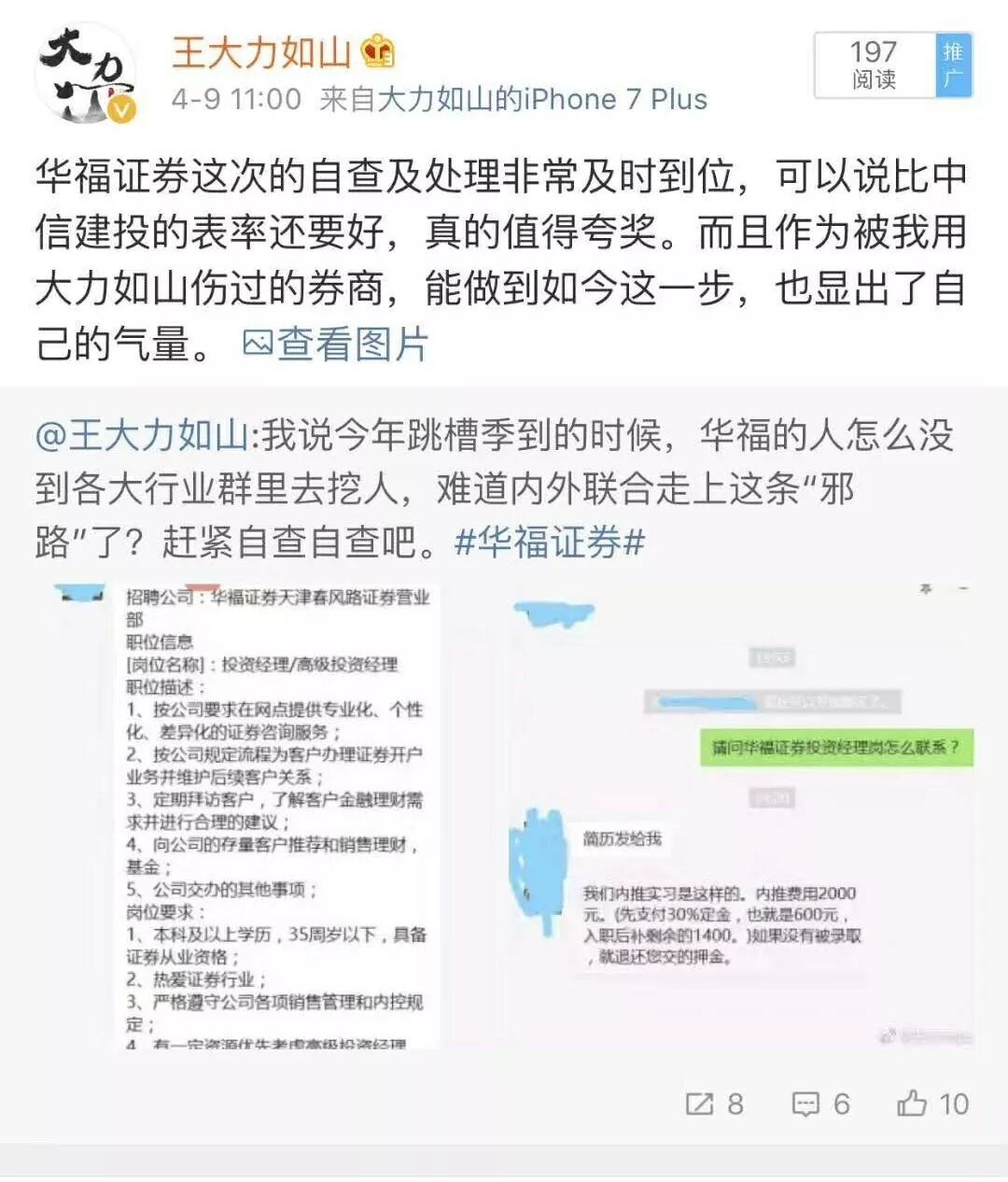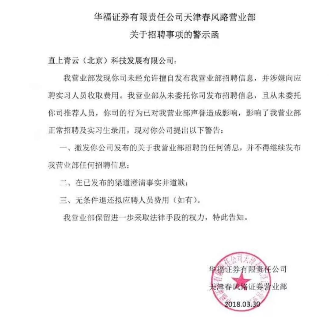 我曾经在微博上点名过华福证券,求证其是不是被收费内推机构利用了。该公司当即就在微博与我进行了联系,表示马上内部调查此事。后来该公司查证后,出具了回应函,并对该机构进行了警告。见下图: