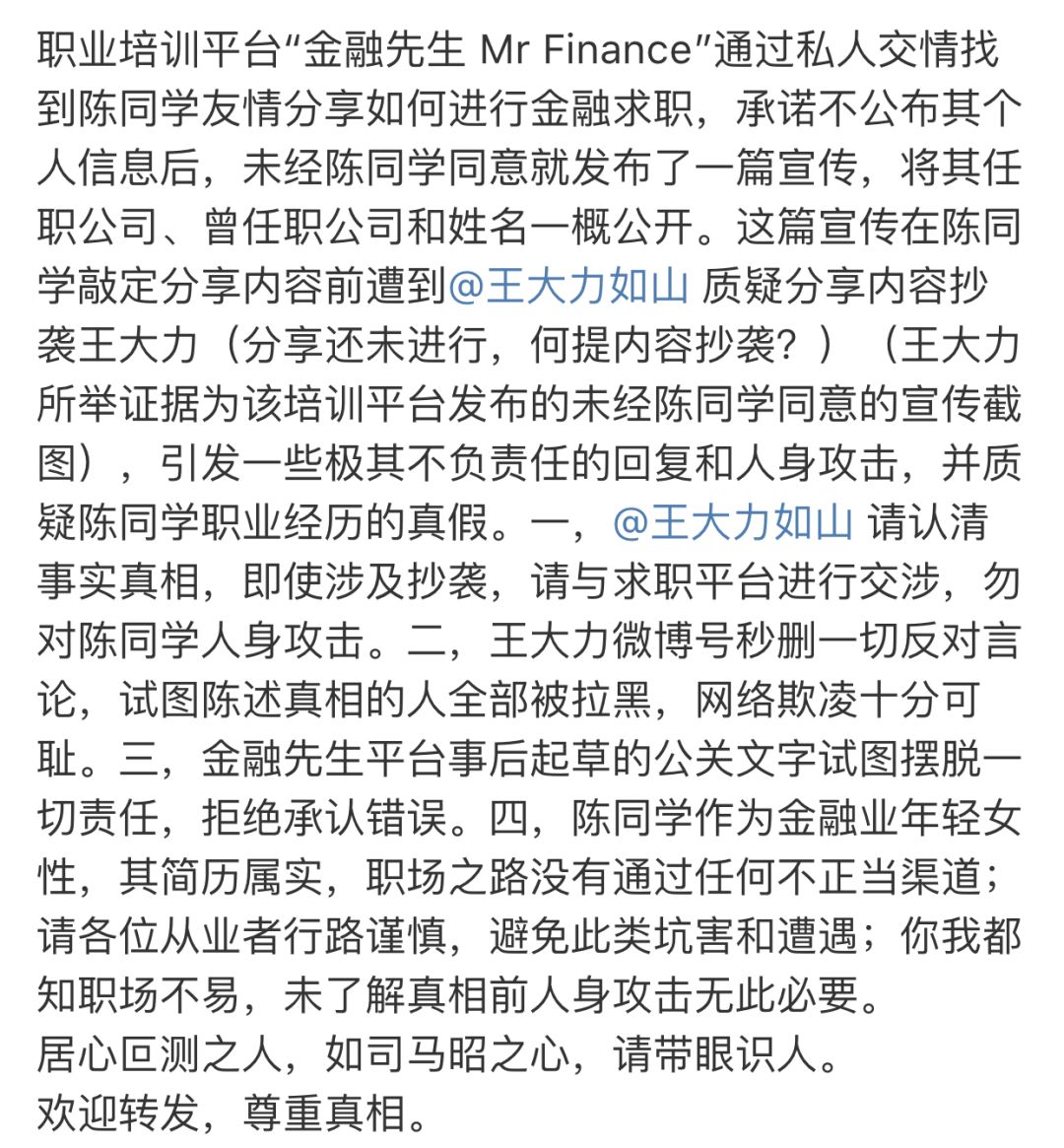 很多朋友都以为我是因为她抄袭,才找她的麻烦。你们错了,我找她的麻烦,是因为她跟收费内推机构合作。不要跟我说什么被机构骗了这些鬼话,如果连这点情商都没有的话,我想可能本就不大适合做投行。再退一步说,在合作之前,你对机构就不进行任何的尽职调查?哪怕百度一下也行啊。如果连这点技术都没有的话,是怎么在国泰君安并购部门实习的?实习时就没人培训最基础的尽职调查?如果这些问题都说不清楚,我觉得任何的道歉都是没有诚意的,投行这个行业就是再low,恐怕也不是靠嘴就能做出来的。