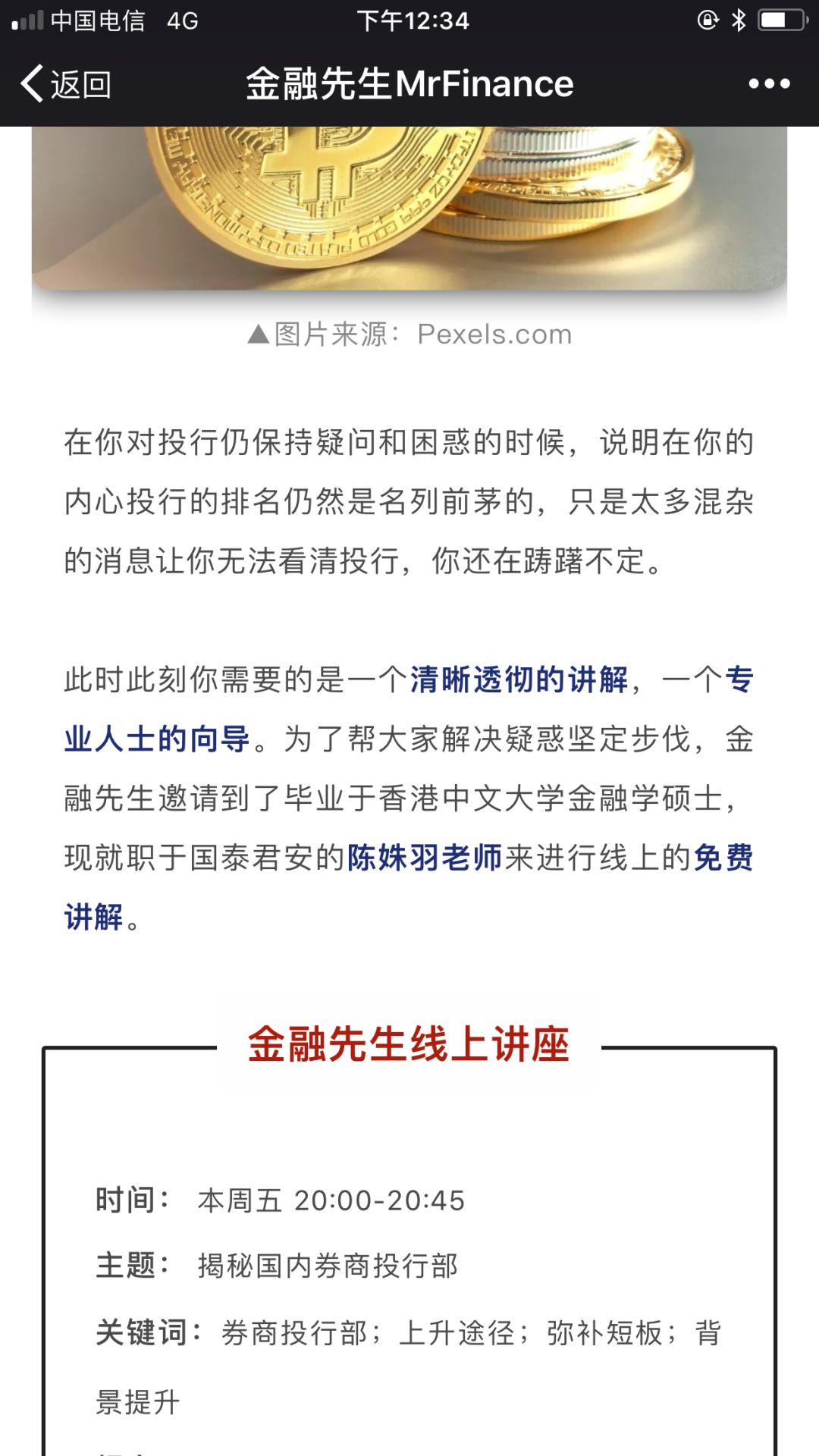 但我今天在微博上发布之后,不少朋友都表示国泰君安查无此人,还给我跑去协会网站上查到俩同名的同业。后来,有了解此人的朋友告诉我,这位小陈老师,16年从上财本科毕业,17年在国泰君安实习,只是一位今年即将入职的年轻人而已。怪不得查不到呢,行啊,可真行啊。一个连正式员工都不是的年轻人,去给一些学生揭秘投行,你就不怕把学生忽悠瘸了?当然,经我曝光,现在这家内推机构的公众号,已经把忽悠文章给删了。但如果我今天不知道此事,明晚八点不知道有多少学生会听这场忽悠呢。