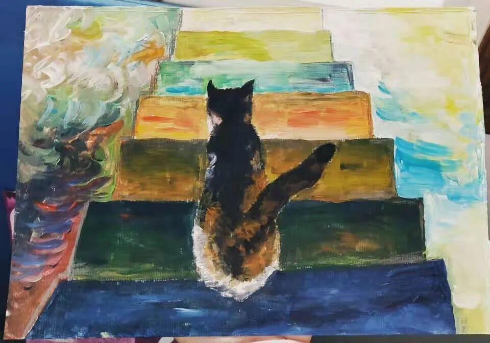 三花猫的遗传特点导致其花色多见于母猫,也可出现在少数没有生育能力的公猫,因此作为一种女性符号。这只猫在走下楼梯迎面而来的是出楼梯间后的自然光,但是在画面上看不出是向下走出楼里还是向上穿过彩云,走上天堂的阶梯。只知道牠在向前。