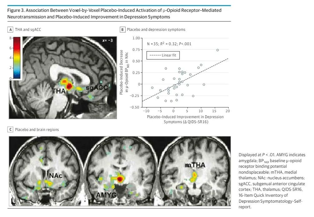 产生安慰剂效应的地方在前扣带回的改变。前扣带回主要涉及突显网络(Salience Network),突显网络的功能就是在体内体外众多的信息中,筛选出一些信息作为重点。健康受试者吃抗抑郁药后,没有什么安慰剂暗示的目的,也会造成前扣带回活动的改变。在分子机制上,前扣带回还涉及脑部阿片类物质的调节。他们研究还使用PET测定了脑部的阿片受体,他们发现,安慰剂治疗效果较好的受试者,在奖赏环路中存在伏隔核较高的阿片受体结合力,这个特点能够预测未来抗抑郁药治疗的疗效。安慰剂效应才是名副其实的“精神鸦片”!此外,功能磁共振结果也发现前扣带回,丘脑,杏仁核以及伏隔核这些受阿片物质调节的脑区存在变化,意味着安慰剂效应的起效时一种脑内自身分泌的阿片类物质在起作用。不过,安慰剂效应对于抑郁症最核心的前额叶,海马这些情绪调节环路的影响不大。![]()