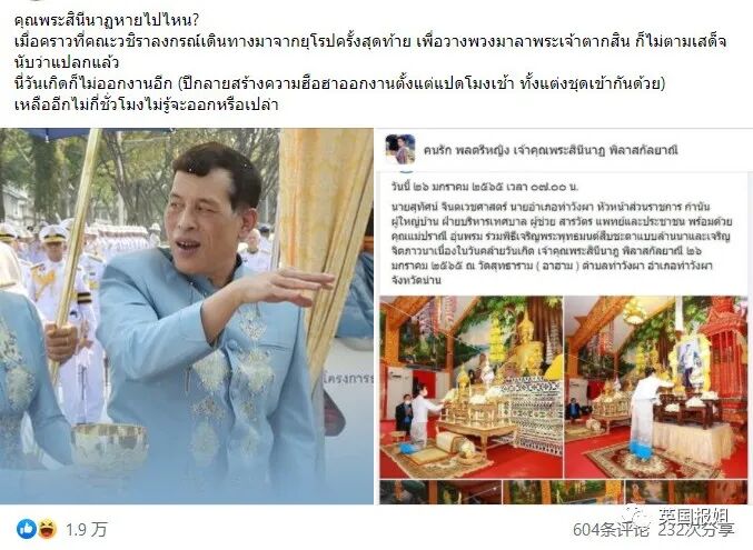 11月20日,泰王又乘专机从德国飞回泰国,主持了玉佛更衣仪式(泰国很重要的一个传统)之后,一分钟没在泰国多待,又飞回了德国。