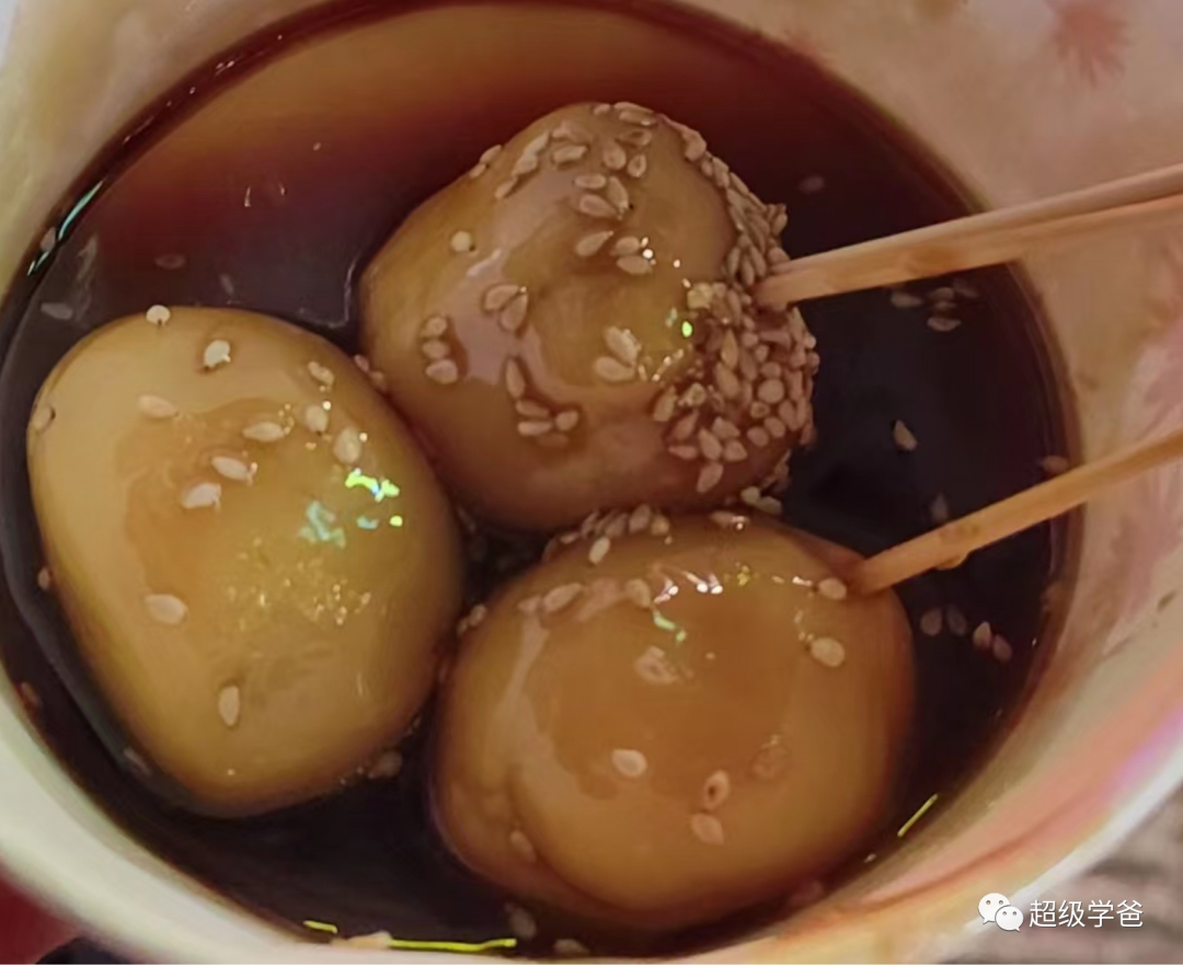 于是我们决定放弃吃桌餐,分头排队。发现有一家章鱼烤串的店队比较短,只用了半个小时就排到了,结果真相是章鱼卖完了,只有肉串。在另一个店排到了糖油粑粑。