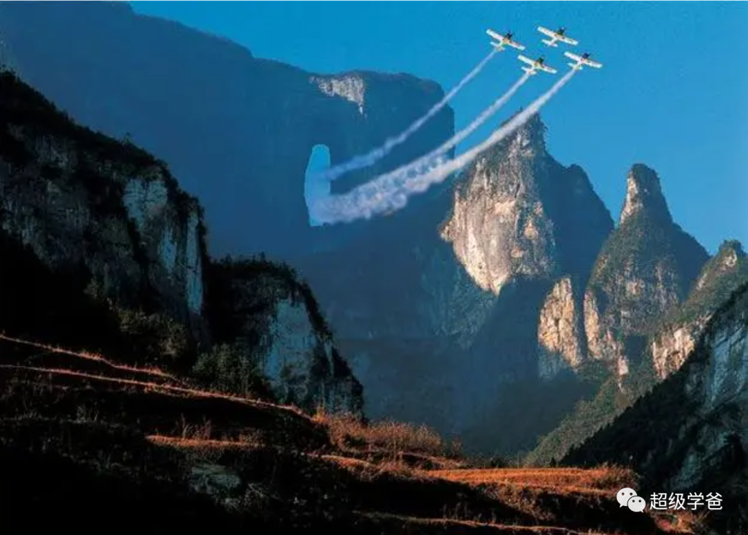 天门山景区的人文特色,也离不开工业化,比如战机多次穿越天门洞,又比如翼装飞行,还比如越野车挑战999阶天梯等等。