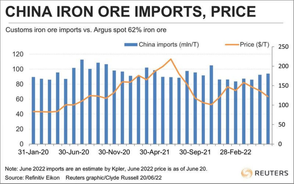 另外,Argus Analytics数据显示中国的铁矿石库存正在下降,从今年初的1.6亿吨下降15%至年中的1.37亿吨。