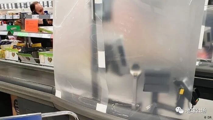 超市透明塑胶布挡在消费者跟柜员中间。图源:Minfu Chien