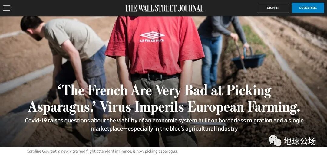 《华尔街日报》报道法国一些农场因疫情影响了芦笋采摘。很多芦笋农场主一筹莫展。图源:《华尔街日报》