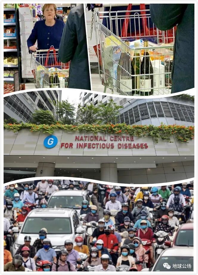 上图为3月,德国总理默克尔现身超市购物;中图为新加坡疾控中心;下图为疫情之下,越南居民出行的自我防护。图源:WUE往期内容
