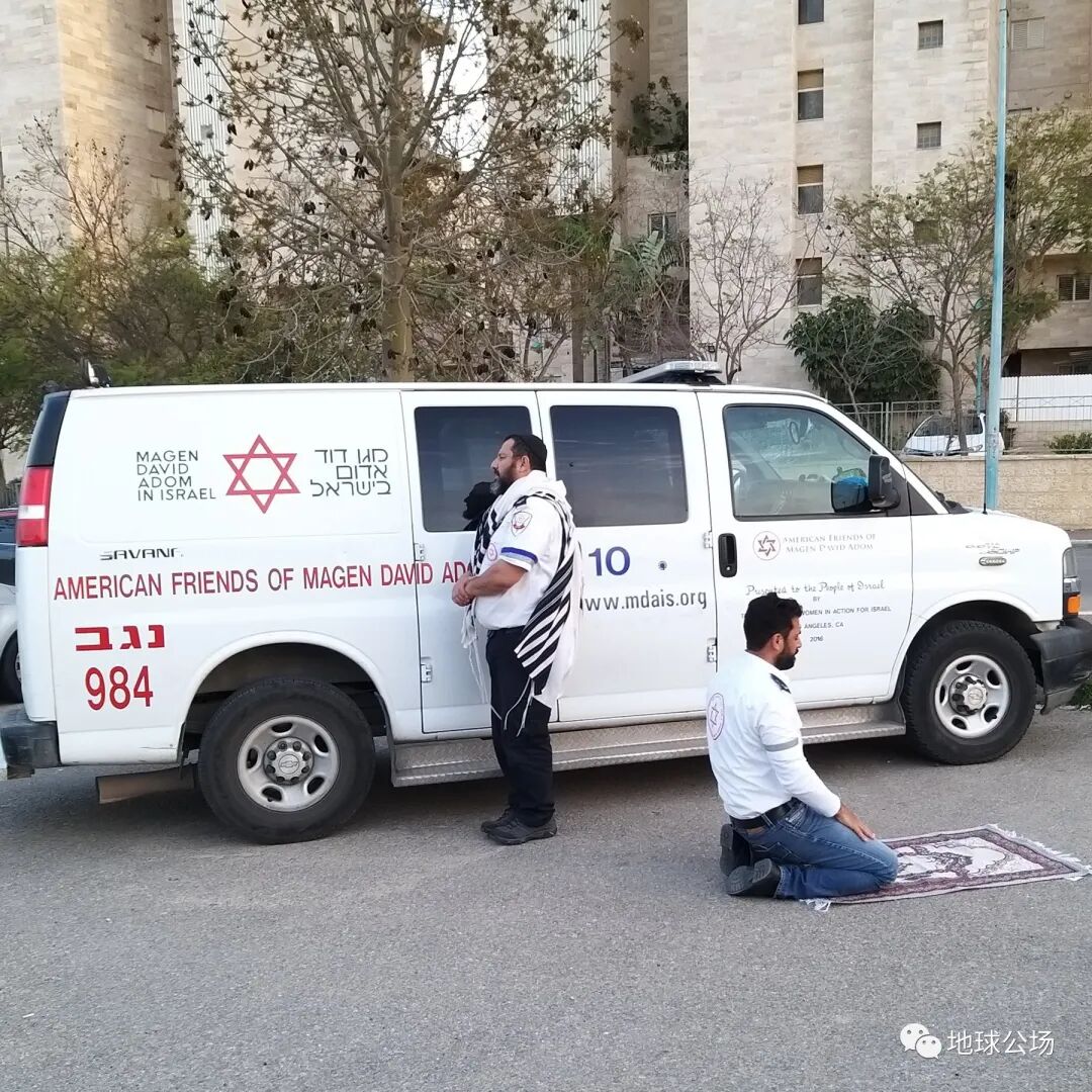 在以色列,一名犹太人向着耶路撒冷方向,一名阿拉伯人朝着麦加方向,一起为疫情祈祷。图源:JINGYI YU