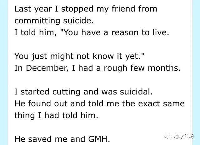 「去年,我发现我的朋友试图自杀,并且成功阻止了他。我告诉他,“你有一个继续活下去的理由,只是你现在还没有找到。”