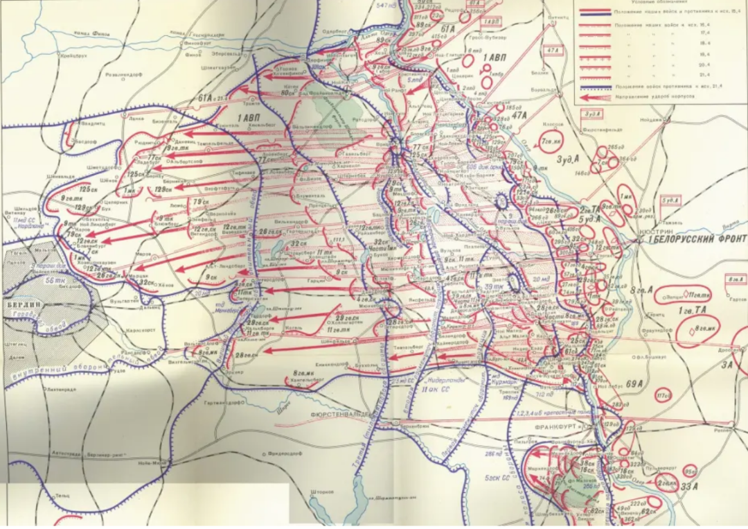 本文谈及的柏林会战的泽洛高地攻防战,既是这样的一场精彩而典型战役。柏林会战又称柏林战役,为第二次世界大战苏德战争中苏军围攻德国首都柏林而发起的一场战略决战。从1945年4月16日持续至5月9日,苏军以白俄罗斯第1、第2方面军、乌克兰第1方面军,8个波兰师,总兵力250余万人,作战部队206万人,6250辆坦克和突击炮,42000门各型火炮,7500架飞机,16万辆汽车,向德军约100万人总兵力,作战部队80万人守备的柏林及柏林外围防御体系,发起攻势作战。泽洛高地攻防战,即为柏林外围规模最大、最为惨烈的一次战役。说起泽洛高地攻防战,首先就要介绍苏军主攻泽洛高地的白俄罗斯第1方面军。白俄罗斯第1方面军并非白俄罗斯人的方面军,或者白俄罗斯地区方面军。白俄罗斯第1方面军最早为中央方面军,是苏军为正面对刚德军中央集团军群,以顿河方面军为基础,加强编组苏军第3、第48、第50、第61、第63和第65集团军;苏联空军第16集团军,以及后来加强编入第10、第11、第47、第69和第70集团军,第聂伯河区舰队等部队编成的多军种、多兵种的战略方面军。1943年10月,中央方面军取得库尔斯克会战胜利,向西战略推进白俄罗斯地区,改称白俄罗斯方面军。1944年2月17日,苏军组织“巴格拉季昂行动”,准备进攻德国中央军群,全面收复白俄罗斯地区。白俄罗斯方面军正式改名为白俄罗斯第1方面军,继续进攻德国中央军群。此后,苏军取得“巴格拉季昂行动”大捷,德军中央集团军群溃败,苏军顺势挥戈西进波兰,直至攻入德国本土,自东向西发起柏林会战。