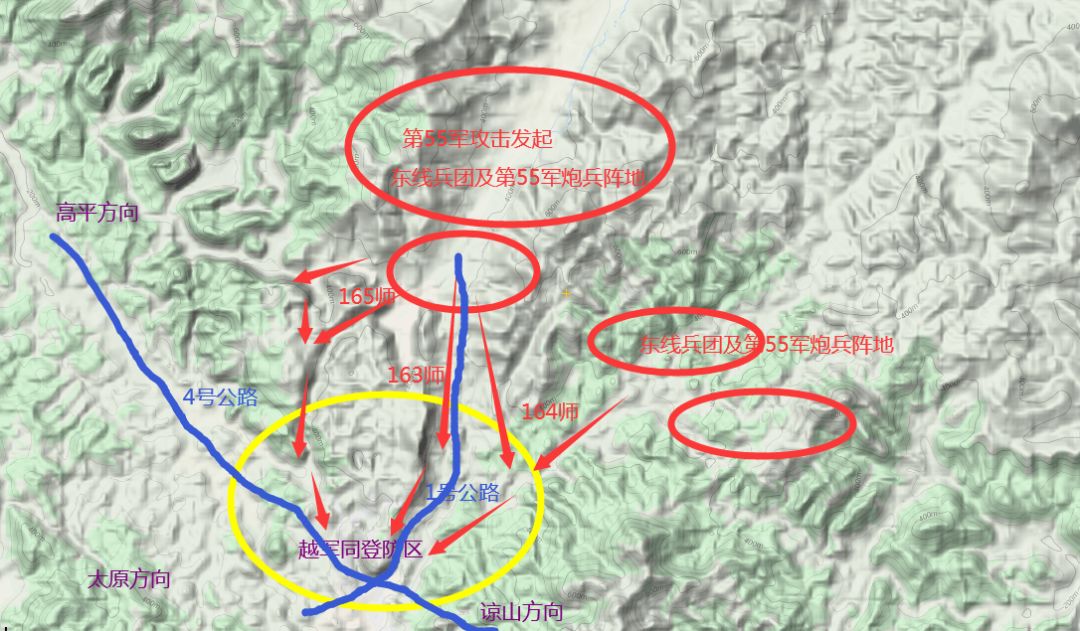 既然强攻同登不得有任何闪失,于是,在山地丛林地形的同等战场,前敌各级老大咬牙跺脚,还是将第55军所部3个师全面展开了。