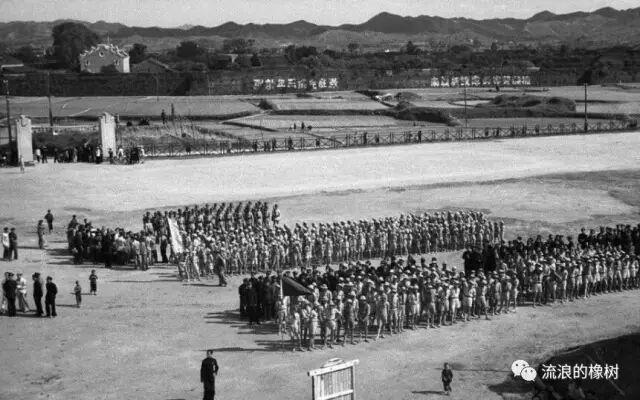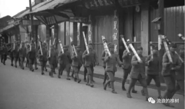 正在训练行军的新兵,枪械匮缺,江西多毛竹,他们砍竹为枪,进行训练。