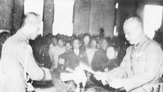 1945年10月25日,陈仪身着军装,佩二级上将军衔,在签署受降令给日军司令安藤利吉之后,即借现场电台发表声明: