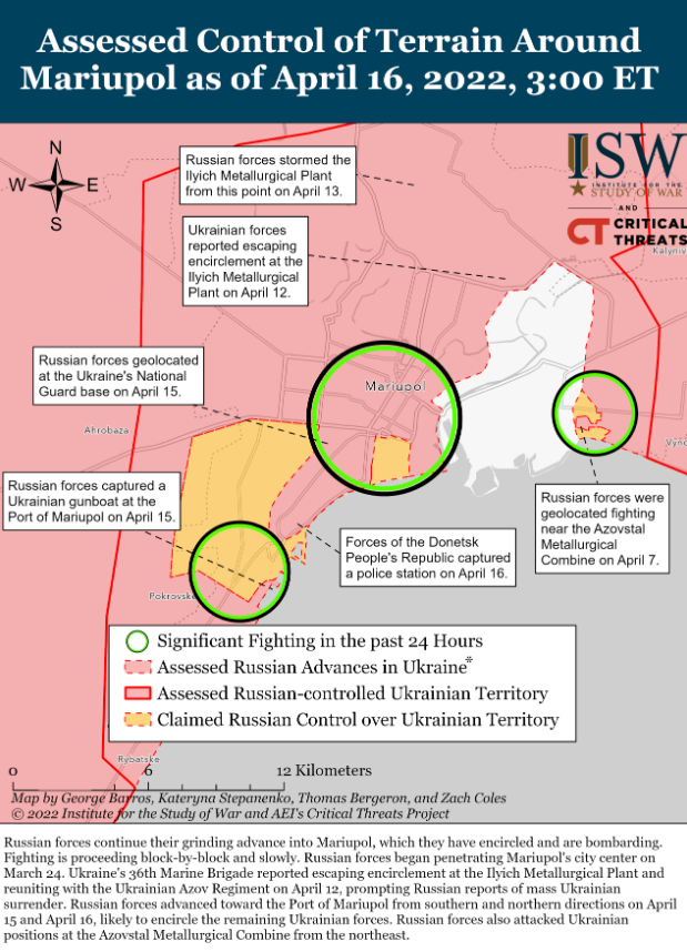 isw机构发布4月16日马里乌波尔战场态势图显示,“Azovstal”工厂为乌军最后的防御据点,目前,战事继续进行,因为俄军的完全包围,马里乌波尔的战况进展消息滞后,情况不详,这时,无论挺俄、挺乌,要想全面、体系、真实讲述马里乌波尔战事,无疑类同吹牛的空谈。