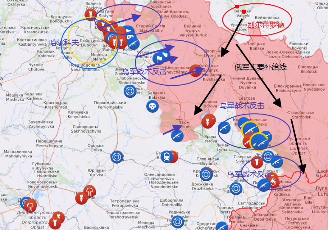 如上图所示,乌军在哈尔科夫以东的库图兹夫卡、拜拉克和马拉罗汉、巴扎利耶夫卡、列比亚哲、库图济夫卡等多个方向,向俄军猬集伊久姆地区的主力侧翼,发起战术反击。