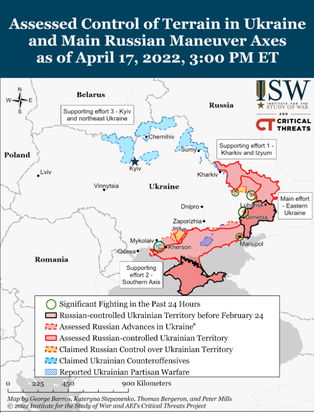 这时,4月17日,乌克兰副国防部长安娜·马利亚尔分析俄军布局,认为俄军“吸取了基辅的经验,不急于在乌克兰东部发动进攻”。