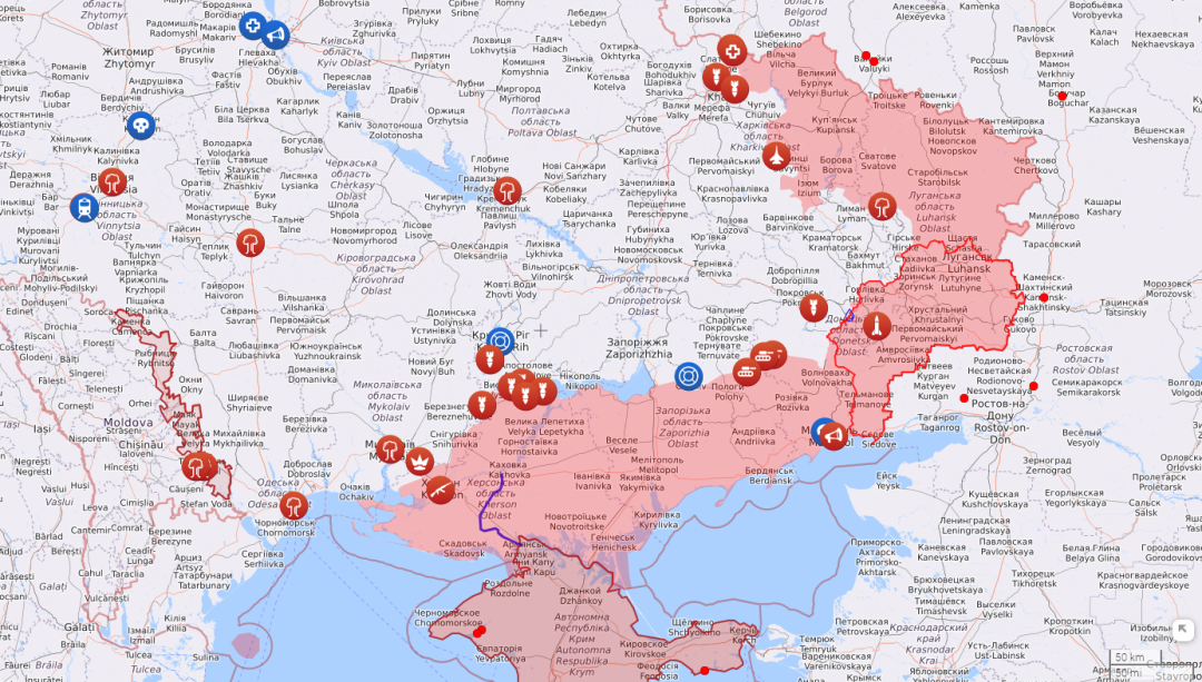 2022年俄乌战争态势图。粉色为俄军控制区。