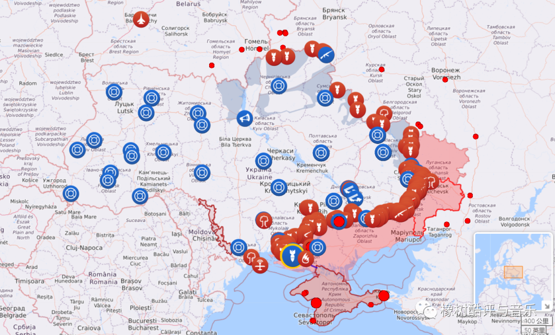 红色圆圈为俄军的无人机行动、进攻、一线炮火狂轰滥炸。