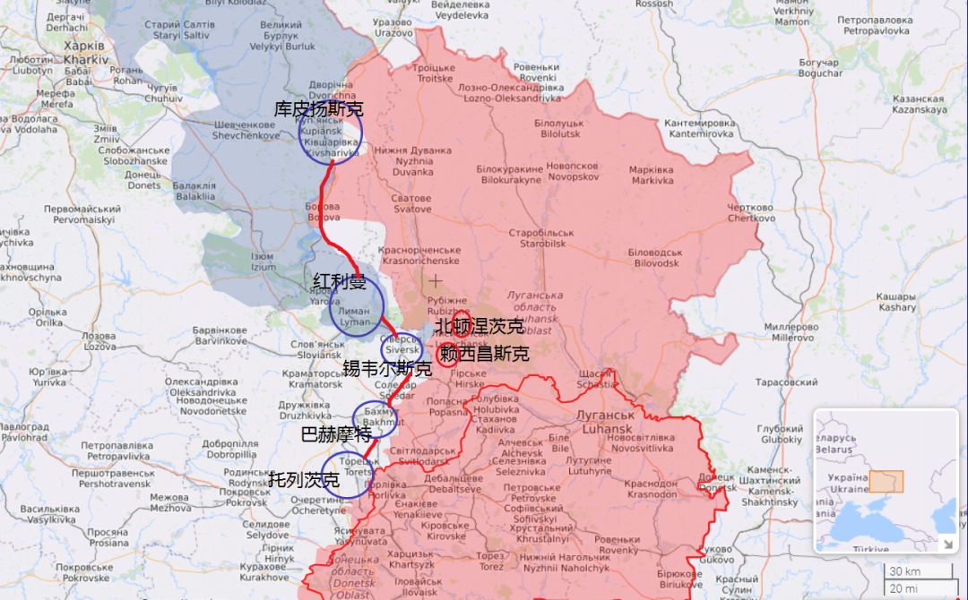 就此,乌军背靠顿巴斯腹地斯拉维扬斯克城市群,形成了从库皮扬斯克及奥斯科尔河东岸凸出部-红利曼-锡韦尔斯克-巴赫摩特-顿涅茨克西北地域的顿巴斯战线,夺得了战场击退的极大主动。如果选择进,乌军可以从库皮扬斯克及奥斯科尔河东岸凸出部、红利曼两个方向,战役钳击克雷明纳,甚至继续东进,切断斯瓦托夫运输线,分隔卢甘斯克地区。如是完成这两个突击,乌军清理腹背的克雷明纳-斯瓦托夫地区的俄军精锐第144摩托化步枪师残部的威胁,即可反手南下,联同乌军锡韦尔斯克集群,对北顿涅茨克和赖西昌斯克地区形成扇形包围态势。如此一来,乌军可在较短时间内对北顿涅茨克、赖西昌斯克等城市发起进攻,继而将卢甘斯克战场推向2月24日战前态势。