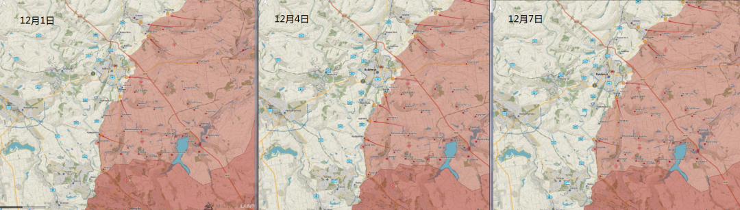 (图2-3)12月14日,俄军发布的巴赫摩特战场态势发展比较图。近日,乌军主力大量调往顿巴斯战场。使得顿巴斯战场成为冬季战争的焦点战场。