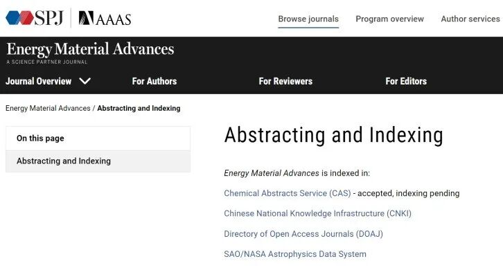 Energy Material Advances(能源材料前沿)是北京理工大学和美国科学促进会(AAAS)/Science共同打造的高水平国际化英文科技期刊,也是AAAS旗下“Science Partner Journal”项目里首个面向能源与材料交叉领域的学术期刊,已经入选中国科技期刊卓越行动计划高起点新刊项目。期刊研究范围涵盖从先进材料到能源科学等多个领域,并从理论、技术和工程等多个角度开展研究。涉及领域包括:清洁能源材料、高能量密度材料、超级电容器、太阳能电池、规模储能、纳米新能源材料、二次电池、燃料电池、二氧化碳捕捉、生物能源、新能源汽车应用基础材料研究等。期刊国际刊号ISSN:2692-7640,CN号:CN10-1792/T,2021年1月正式上线,迄今已被DOAJ、CNKI、SAO/NASA ADS、CAS等数据库收录。