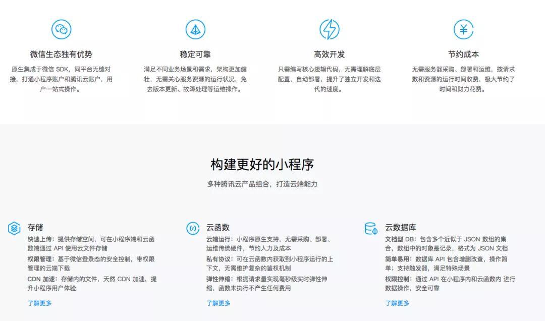 「云开发」由腾讯云支持,从腾讯云的「小程序·云开发解决方案」中可以看到,它实现的功能,和新上线的「云开发」是一致的。