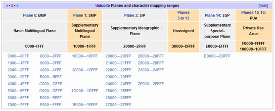 其中第 0 个层面 BMP,基本涵盖了当今世界用到的所有字符。其他的层面,要么是用来表示一些远古时期的文字,要么是留作扩展。