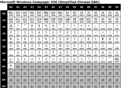 (关于 936 代码页中完整的码表信息,参见MSDN:http://msdn.microsoft.com/en-us/library/cc194913%28v=MSDN.10%29.aspx.)