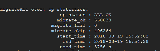 4.整个迁移结束后会打印统计信息,包括累积的迁移成功量,失败量,跳过量,耗时。对于失败的情况,请查看 error 日志,或重新运行,因为迁移工具会跳过已迁移成功的,对未成功的会重新迁移。运行完成结果示意图如下图所示: