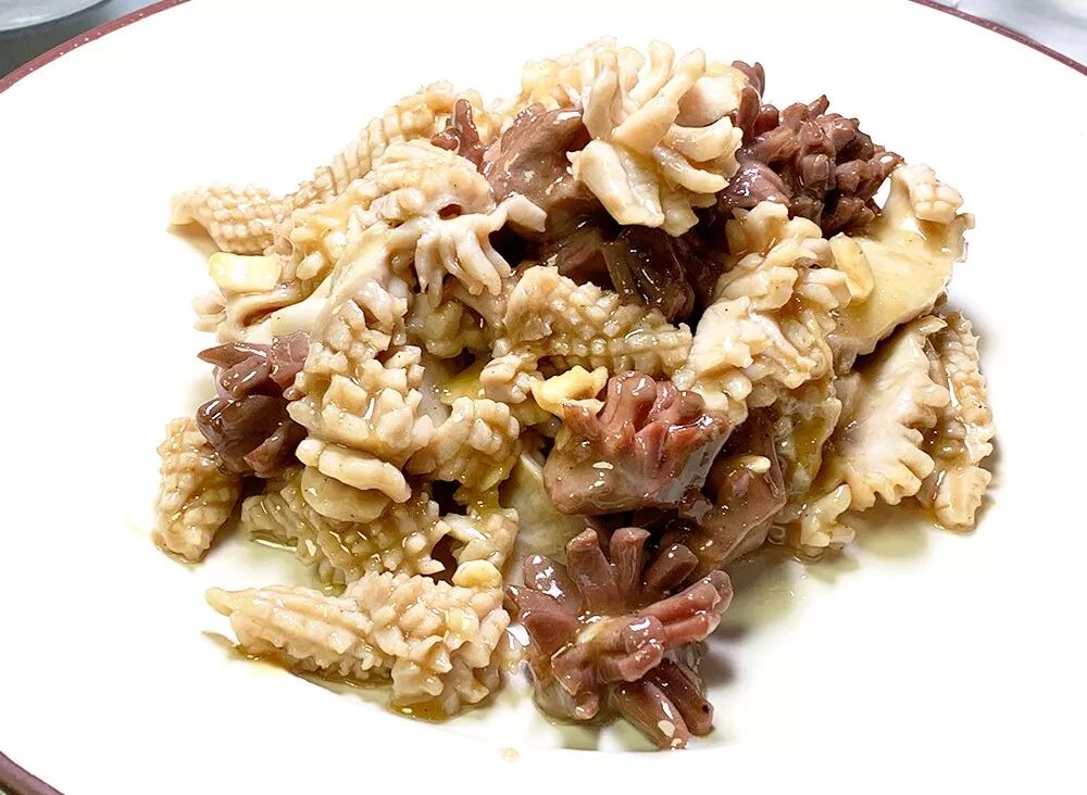 油爆虾是包邮区群众喜闻乐见的家常菜,上桌先看虾头可否一起轻松吃下,那说明壳已全脆;二看肉是否坚结与细嫩同存,那说明新鲜虾肉尚未过熟,杨师傅的火候显然能同时做到这两点。传统手法的调味让色(鲜红虾壳裹上酱油汁)、香(虾的鲜香和酱汁、葱香)、味(咸甜的酱汁和鲜甜的河虾交织)一应俱全,无论是迎接外地朋友还是本地亲友都颇受好评。里园会出有这道菜还得算我和几位朋友使坏,二访定菜单时从一本老旧的《杭州菜谱》中翻出几道金牌菜来“折腾“杨师傅,其中最有难度的就是这出自鲁菜的爆双脆。所谓双脆,就是肚头和鸡胗,处理费时费力,一样样去筋皮划花刀差不多要个把钟头。更难的是炒制时的火候,鸡胗先趁滚油下锅,稍后肚头下锅翻炒,再勾薄芡加调味一气呵成,全程不到一分钟。出品白红相间,入口脆出声响,愉悦的荤香连绵不断,内脏料理的至高瞬间即使如此。后因足够厚实的肚头难觅,以及过于费时费力,菜单上的爆双脆逐渐从爆墨鱼花加鸡胗变成最终的爆全胗,但火候和脆感仍在,几乎没有失手之时。![]()