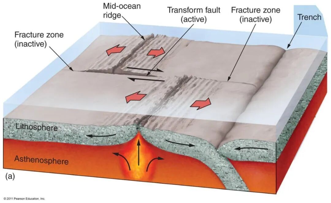 大部分转换边界在大洋底部被发现,他们把大洋中脊分割成一段段,也让大洋中脊看起来呈锯齿状。