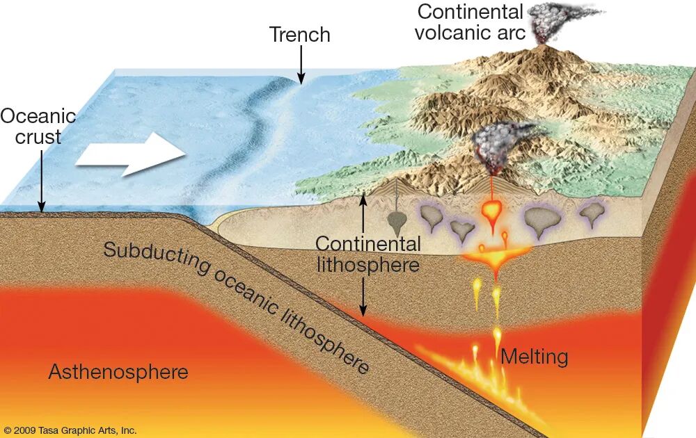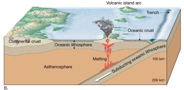 大洋板块俯冲到100公里的深度时,在高温高压下就怂了,变成熔融状态。