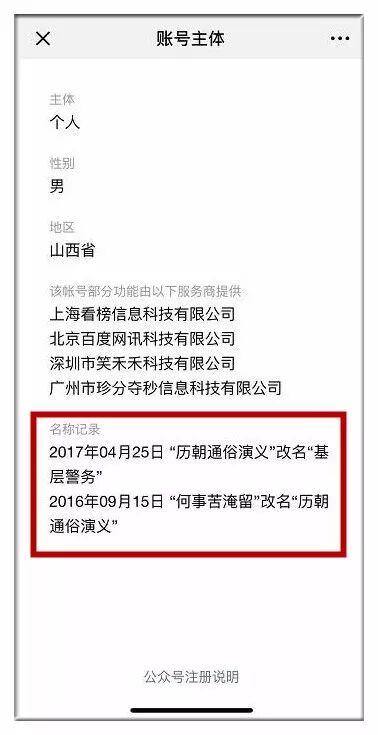 再回过头来,说说发布这篇刷屏文章的公众号“基层警务”,细心的朋友可能已经发现,它的注册信息,并不是公安机关的官方信息,而是由个人注册的,此前曾有两次改名记录,推送的疑似为历史文摘类内容。