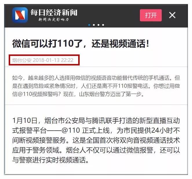 原稿来自烟台公安,其中提到:1月10日,烟台市公安局与腾讯联手打造的新型直播互动式报警平台——@110正式上线....烟台人不仅可以通过微信报警,还可以与警察进行实时视频通话。