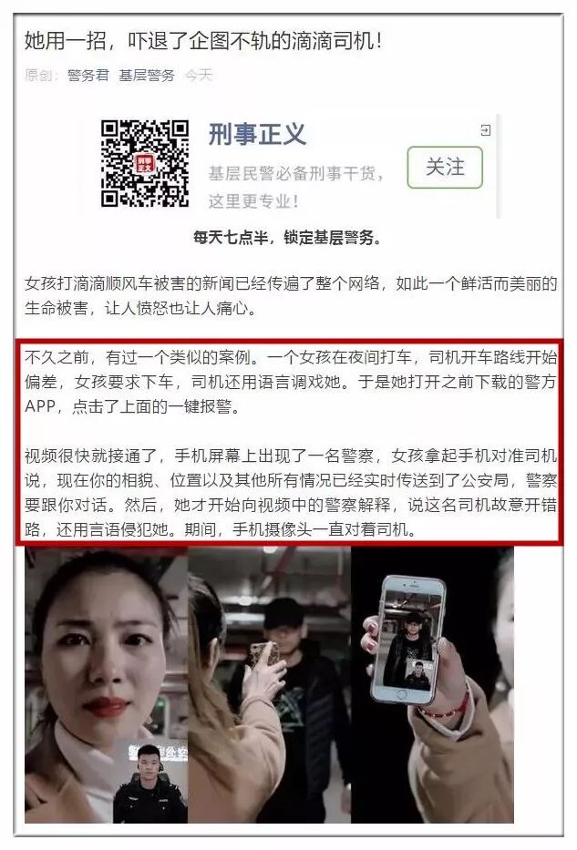 3、情景模拟中表现的是坏人尾随女孩,而在“基层警务”的文章里,变成了“吓退滴滴司机”。