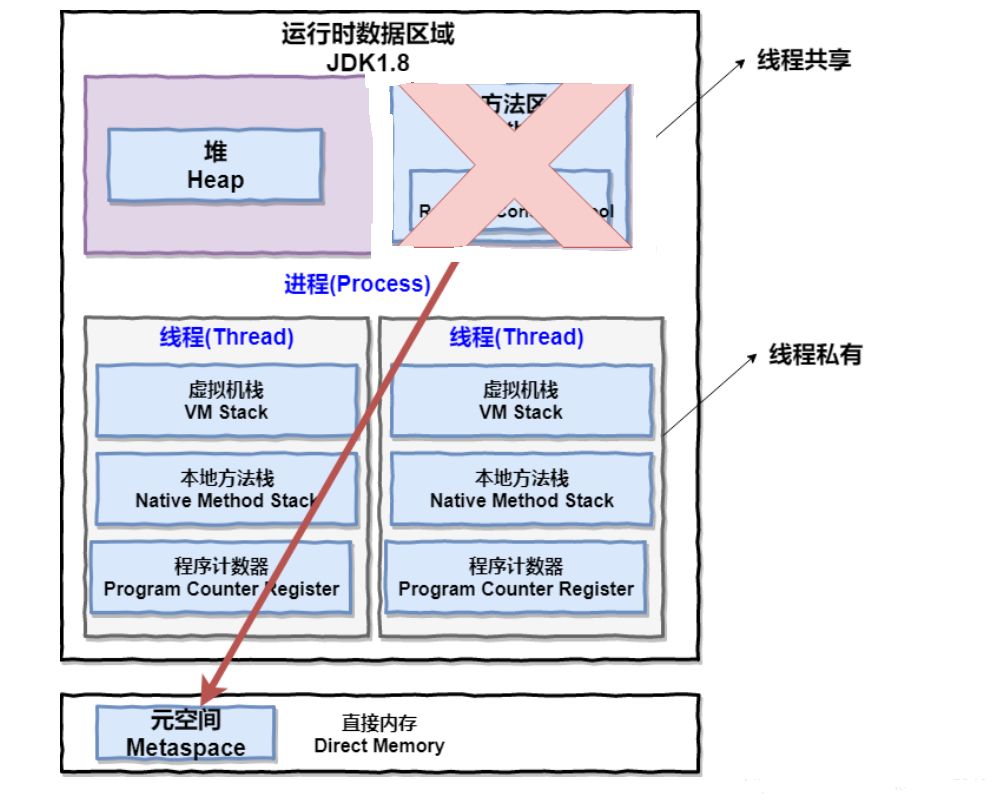 JDK 1.8 的时候,方法区(HotSpot 的永久代)被彻底移除了(JDK1.7 就已经开始了),取而代之是元空间,元空间使用的是直接内存。