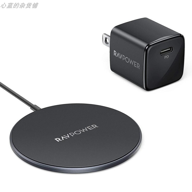 套装内RAVPOWER睿能宝品牌10瓦WC012款磁吸无线充,线长1米,使用TYPE-C接头供电,采用金属底壳质量极佳,实测苹果13PM手机7.5瓦左右,散热温度控制还不错,合适苹果12、13手机用户使用。